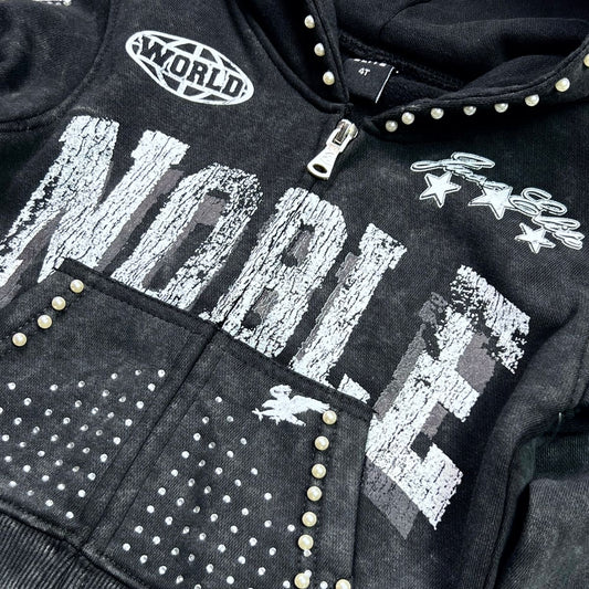 Noble Black Washed Rhinestones + Pearls Infant Boys Hoodie Zip UpRegular price $65.00Regular priceUnit price / per-